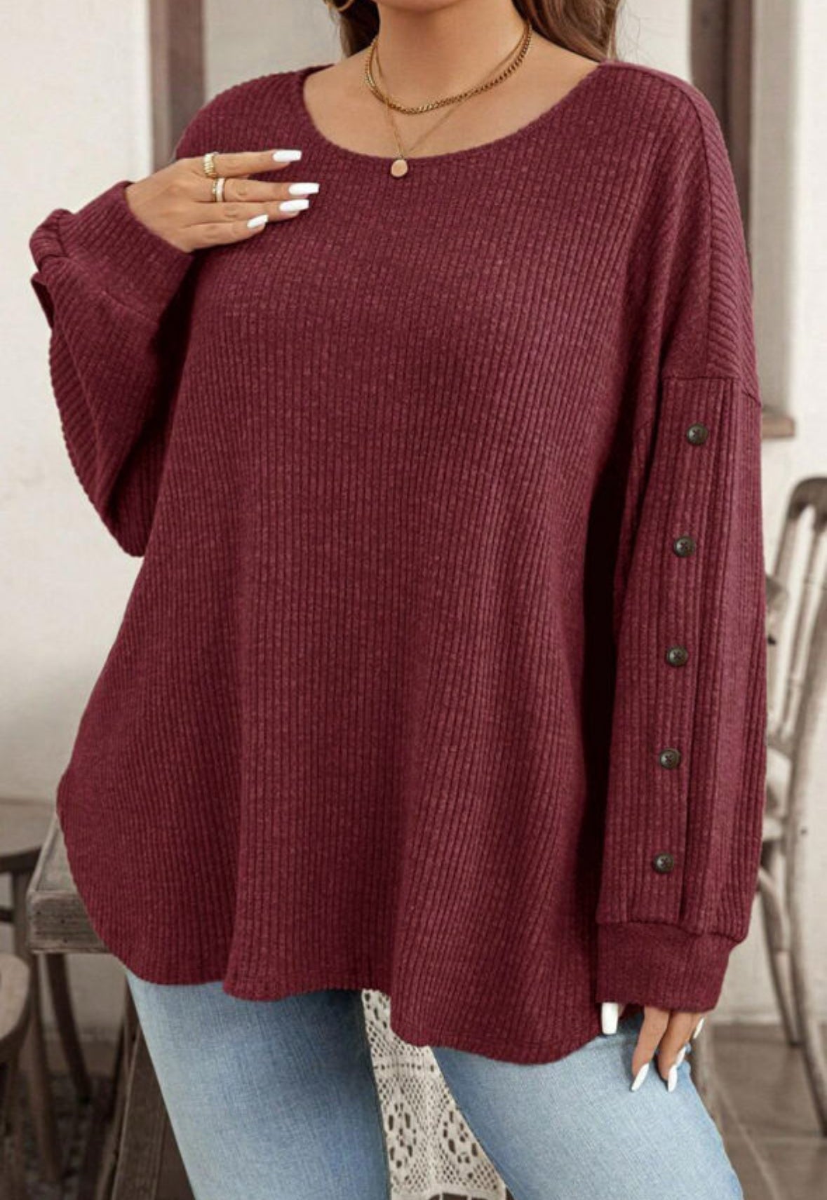 Ribbed Blouse with Button Sleeve Detail